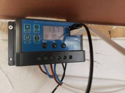 Le régulateur de charge avec une sortie 12V (par le fil noir qui descend sur la droite du boitier), et qui permet aussi de brancher un cable USB alimenté directement:
